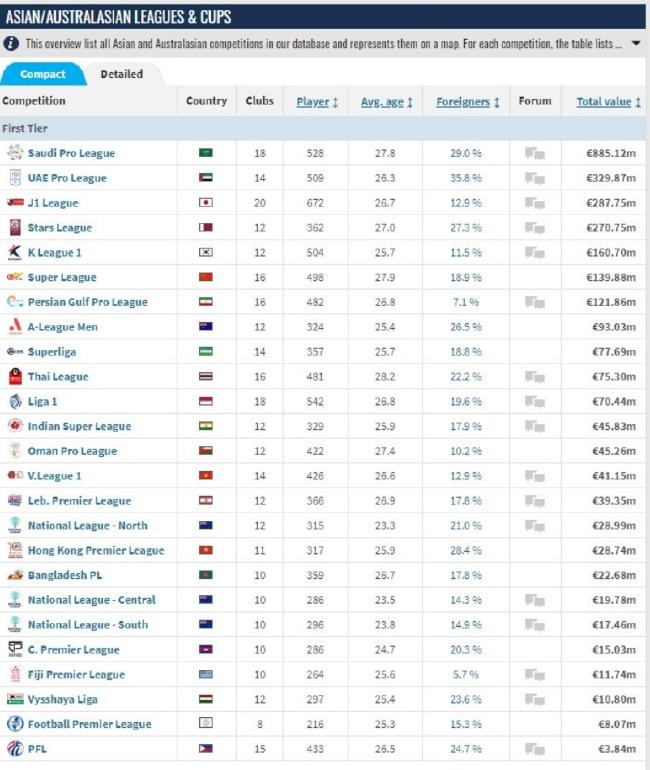 Asian league worth ranking Saudi Arabia cliff leading the Chinese Super League sixth 【JIAYU]